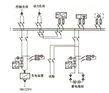 (3)方案三:?jiǎn)文妇€分段(一組蓄電池,兩套充電裝置)接線,見圖2-3。特點(diǎn):接線可靠、靈活,一組蓄電池經(jīng)兩個(gè)空氣斷路器分別接到兩段母線上。兩套相同容量的充電裝置接在不同